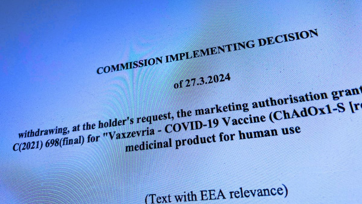 An EU document dated March 27, 2024 highlighted that AstraZeneca formally requested the withdrawal of its COVID-19 vaccine, “Vaxzevria - COVID-19 Vaccine (ChAdOx1-S [recombinant]),” from the market.