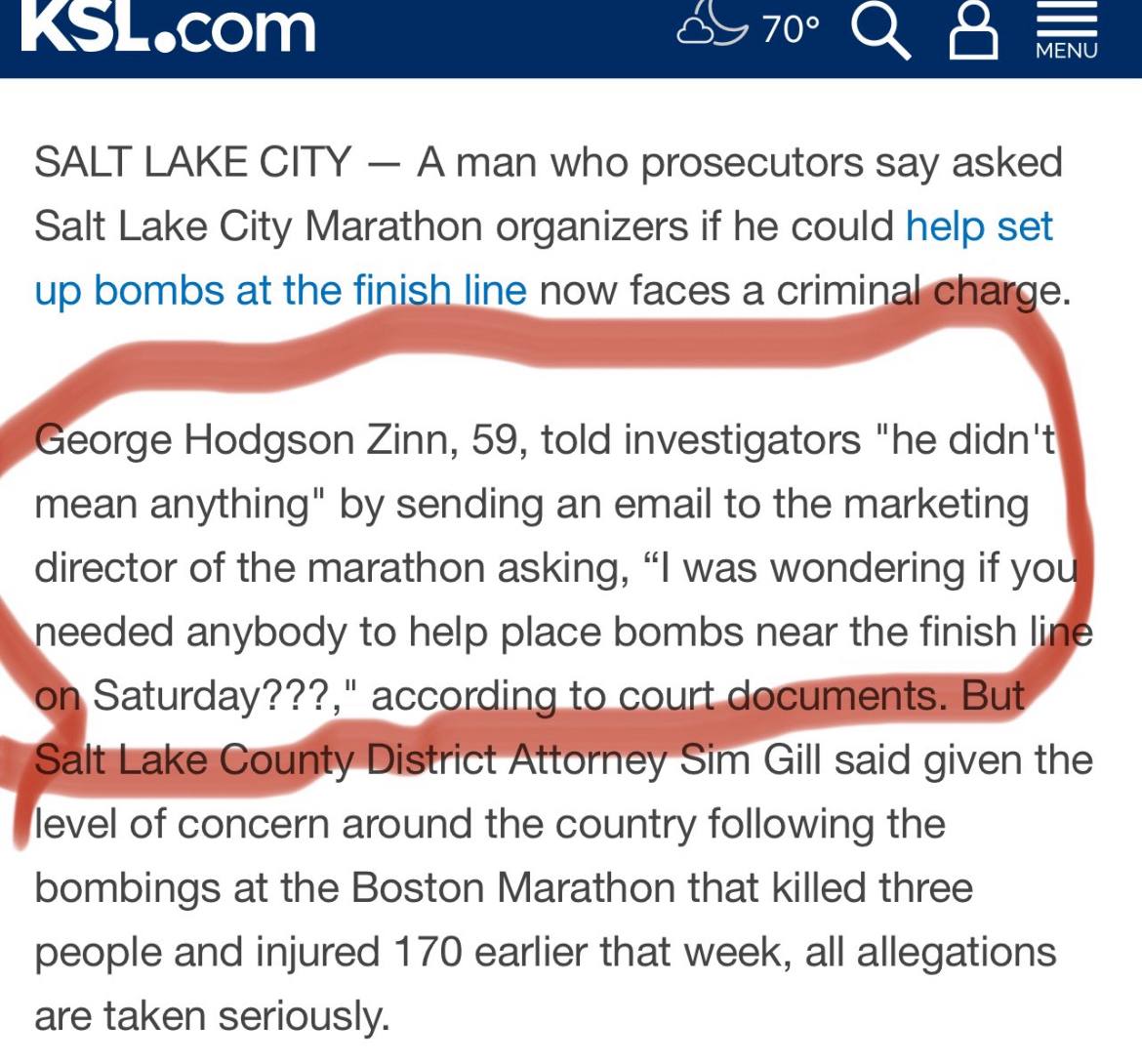 > Salt Lake City Marathon Bomb Threat - 2013 UT man charged with making bomb threat at marathon | AP News
