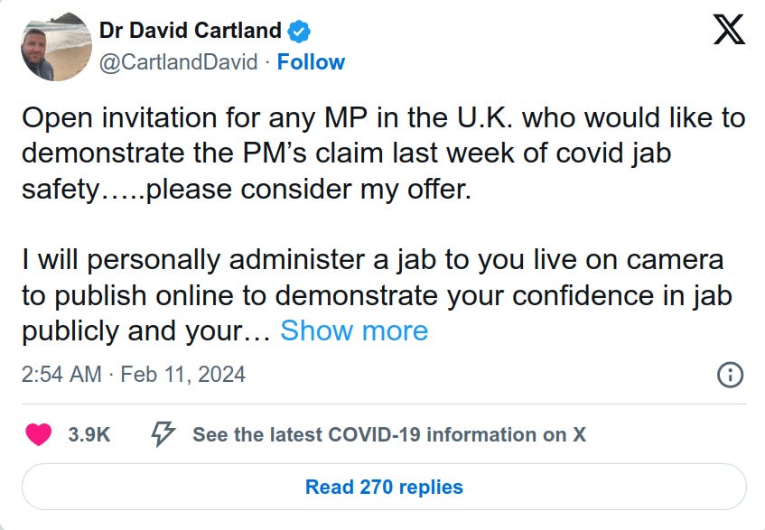 Dr David Cartland: Open invitation for any MP in the U.K. who would like to demonstrate the PM’s claim last week of covid jab safety…..please consider my offer.