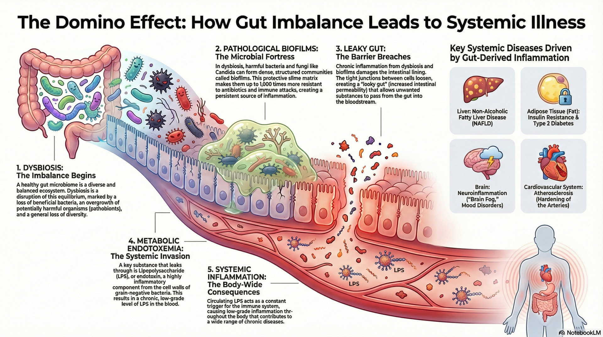 The concept rests on recognizing that the relationship between humans and their microbiota is not merely commensal but fundamentally mutualistic—bacteria perform metabolic functions the host cannot, synthesize essential vitamins, educate the immune system, maintain epithelial barrier integrity, and produce neuroactive compounds that influence brain function. Dysbiosis represents a departure from this functional equilibrium toward a state characterized by: loss of beneficial organisms, expansion of pathobionts (organisms normally present but potentially harmful when ecological constraints are removed), diminished overall diversity, and altered metabolic outputs that affect host physiology systemically.