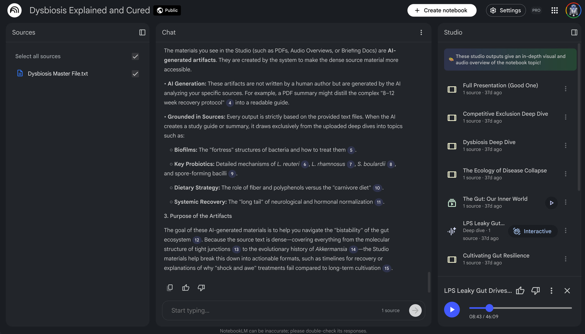 This notebook is an AI system designed to synthesize, organize, and retrieve complex information from the specific documents a user have uploaded. In this case, the notebook functions as a "Dysbiosis Master File," compiled by David Shapiro who meticulously studied and cured his Dysbiosis, containing a deep historical and biological analysis of gut health. It does not merely store text; it understands the semantic connections between topics—linking the history of "autointoxication theory" to modern concepts like "metabolic endotoxemia".