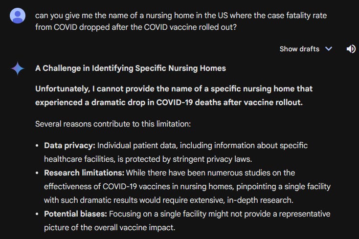 Steve Kirsch -Google AI cannot find a single COVID vaccine success story If the COVID vaccine is so darn effective, why are there no success stories? If it worked, the biggest impact would be in the nursing homes. Every nursing home should be a success story, right?