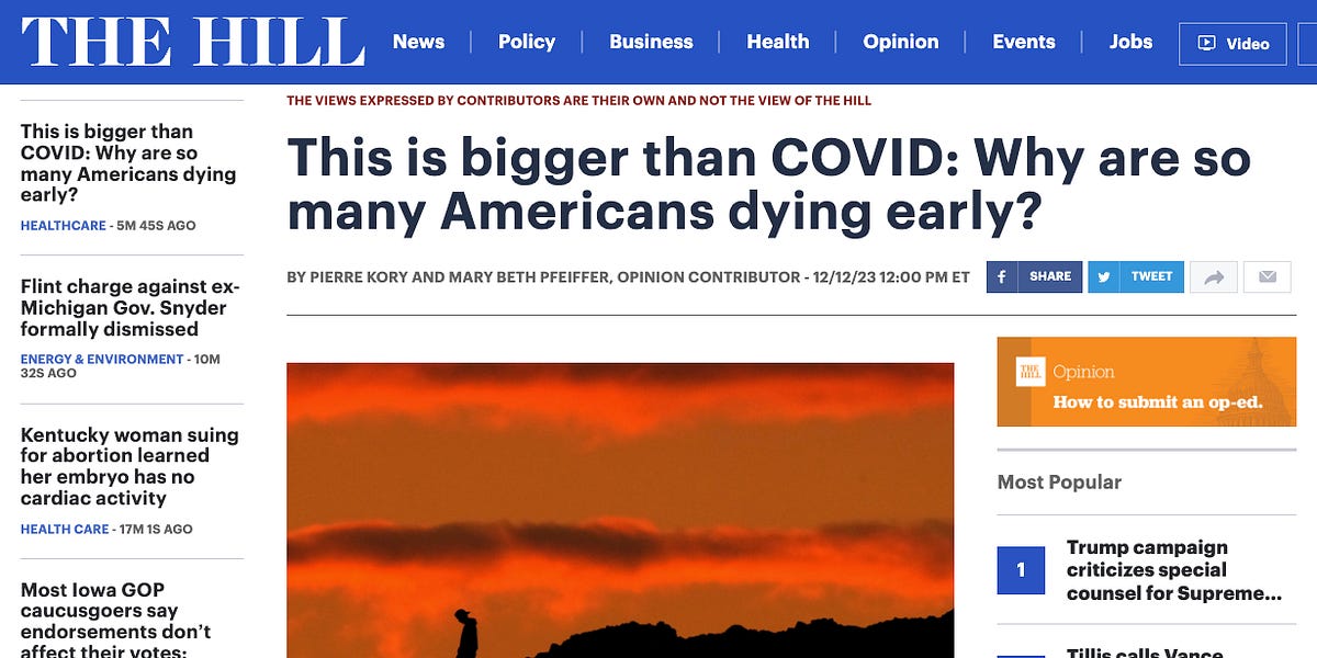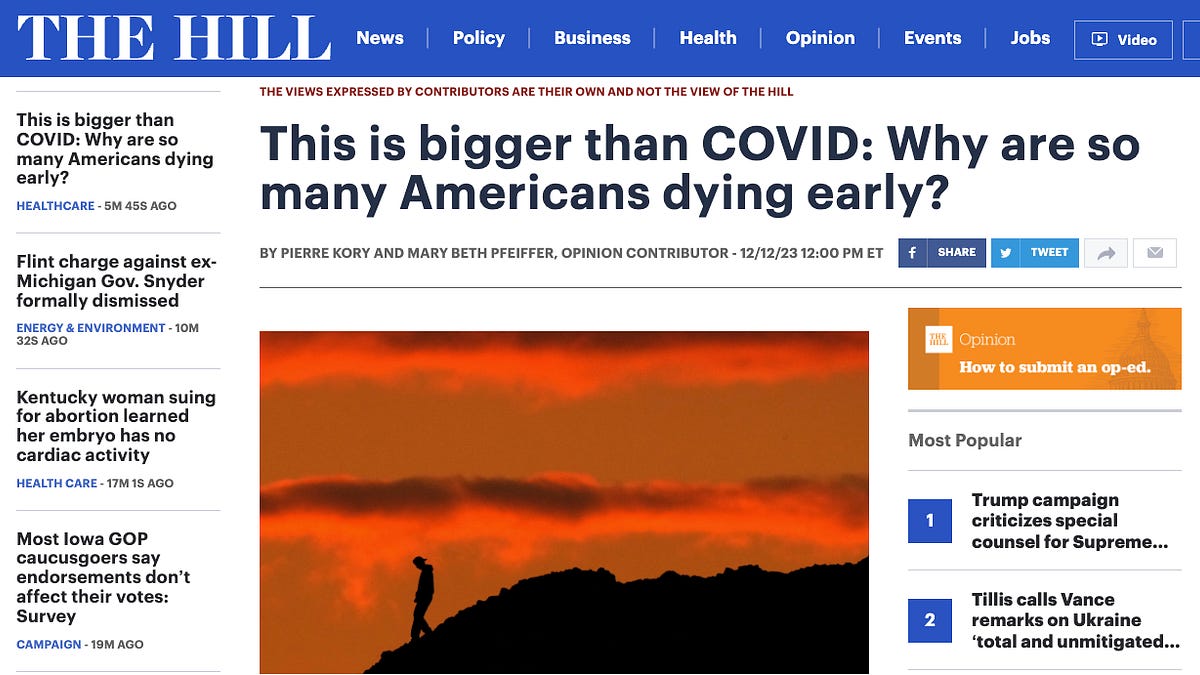 If you take a close at the numbers...the life insurance companies have done this... it's the timing... the timing is really Inarguable. We have to answer the question - why are the healthiest elements of society suddenly started dying at rates we've never seen before in 2021 and it continues. We're left with the question - what happened in the American workplace in 2021 that lead to this unprecedented rate of death? The challenge is we're trying to ask the question. We wrote that op-ed, trying to put that data out there.