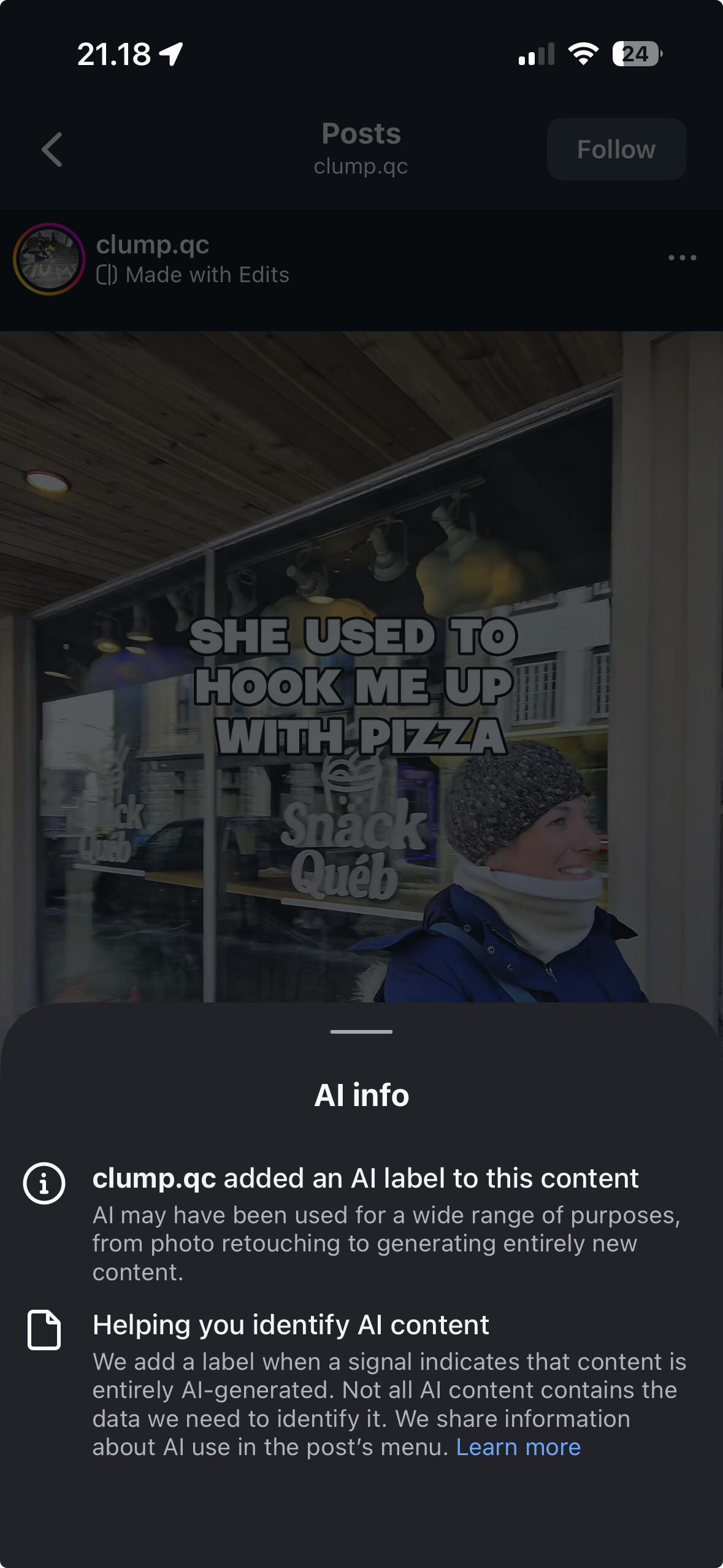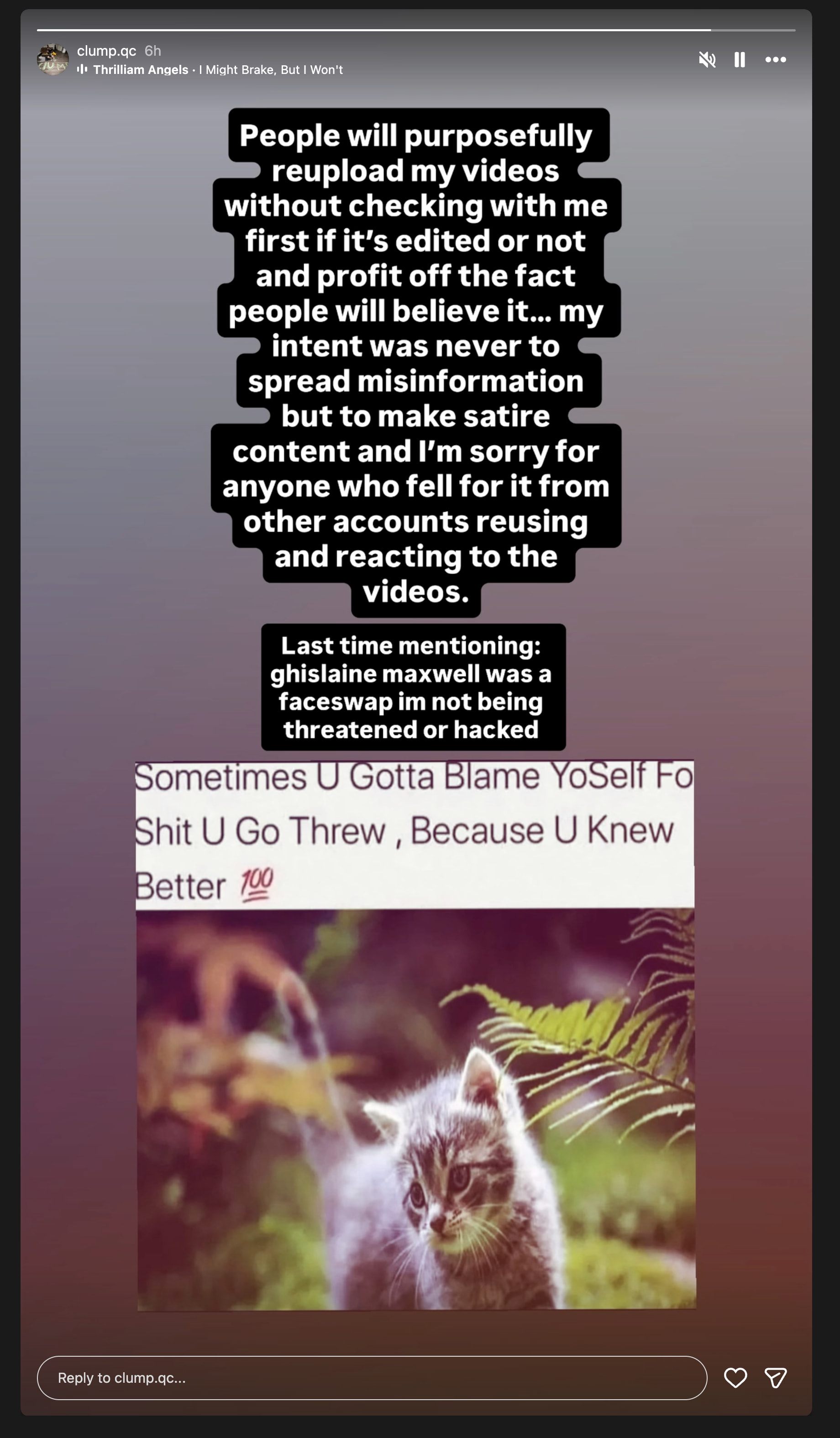 Now if my video is fake someone would have to have added the frames, somehow upscaled the video and made the tell-tale deep fake signs in blatant (they are quite blatant in the lower resolution ones too) and then there is the clump.qc Instagram persona that would need explaining.