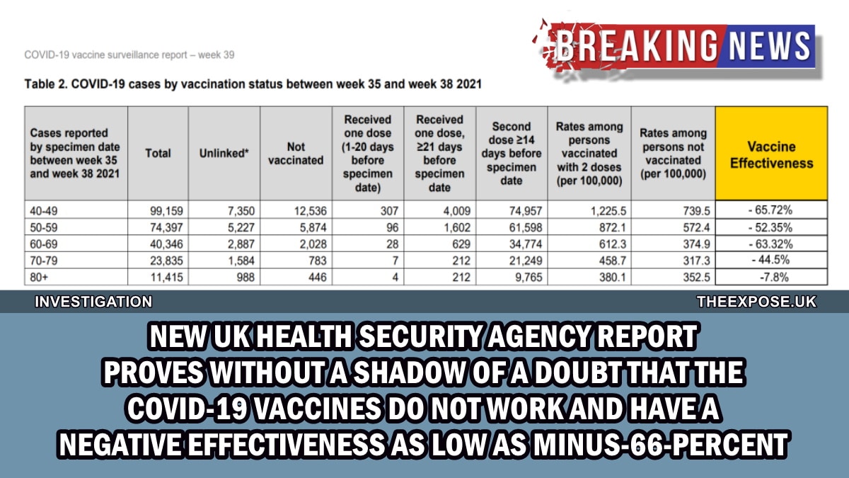 Public Health England has now been axed in favour of the new disturbingly named UK Health Security Agency, and one of the first reports published by the UKHSA shows that the Covid-19 vaccines do not work and have a negative effectiveness as low as minus-sixty-six-percent.