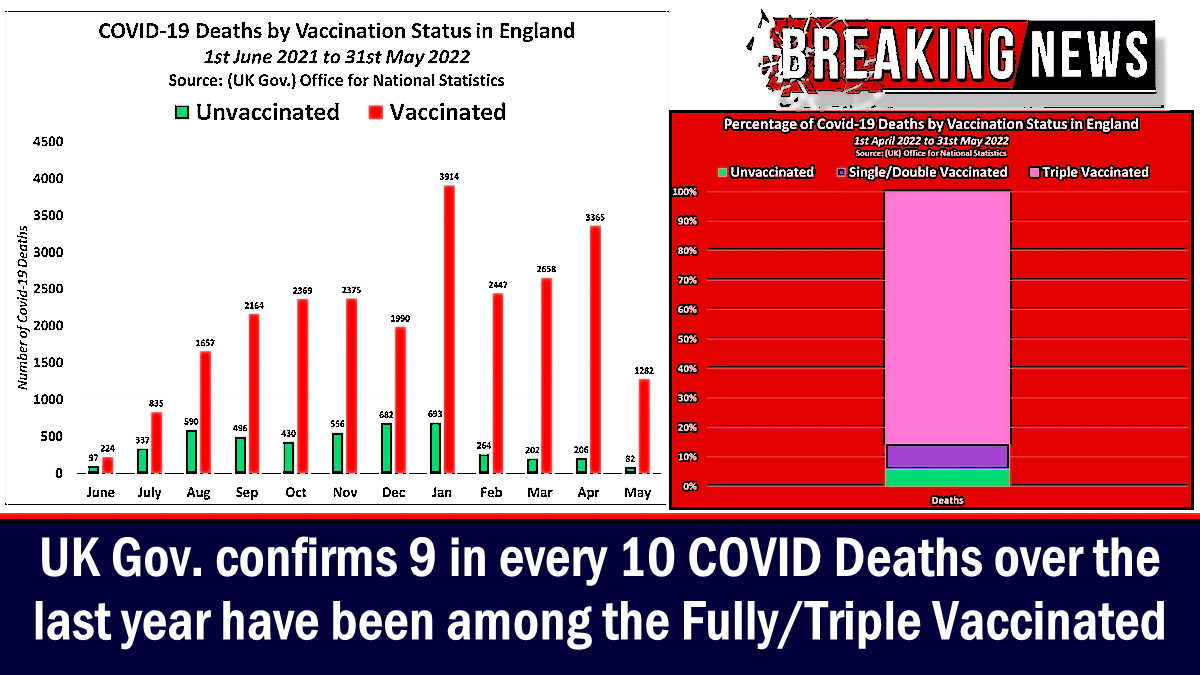 Official figures published by the UK Government reveal the fully/triple vaccinated population have accounted for over 9 in every 10 Covid-19 deaths in England over the past year, 91% of all Covid-19 deaths since the beginning of 2022, and 94% of all Covid-19 deaths since the beginning of April 2022.