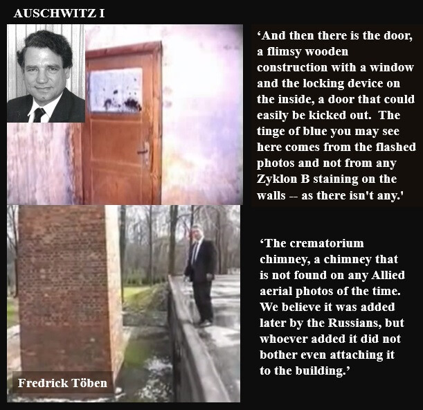 The image you provided features Fredrick Töben, a prominent Holocaust denier, and highlights two common arguments used to question the history of the Auschwitz I crematorium (Krema I).