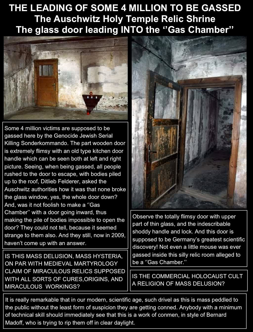JF, also if you could answer these questions: The main supposed gas chamber at Auschwitz had a flimsy wooden door with a glass pane that opened inwards. Now if inmates were gassed, their bodies would pile up and how could the Nazis open the door, with all the bodies piled up behind it. Apart from why did the Jews not simply kick the door down to escape? 4 million Jews were originally supposed to have been gassed here, this was revised down to 1.5m, though the 6m figure total remains the same for some strange reason.