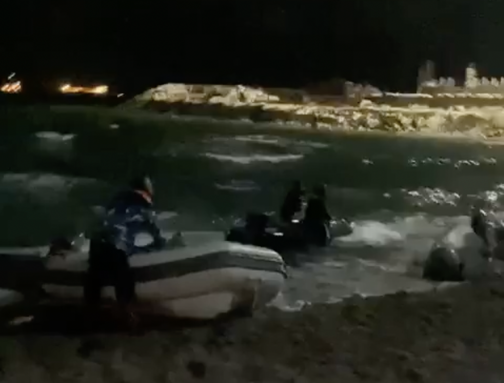 At one point in the footage, one of the officers appears to draw a weapon and fire five shots toward the sand as a barrage of rocks splash into the sea around him and his colleague.