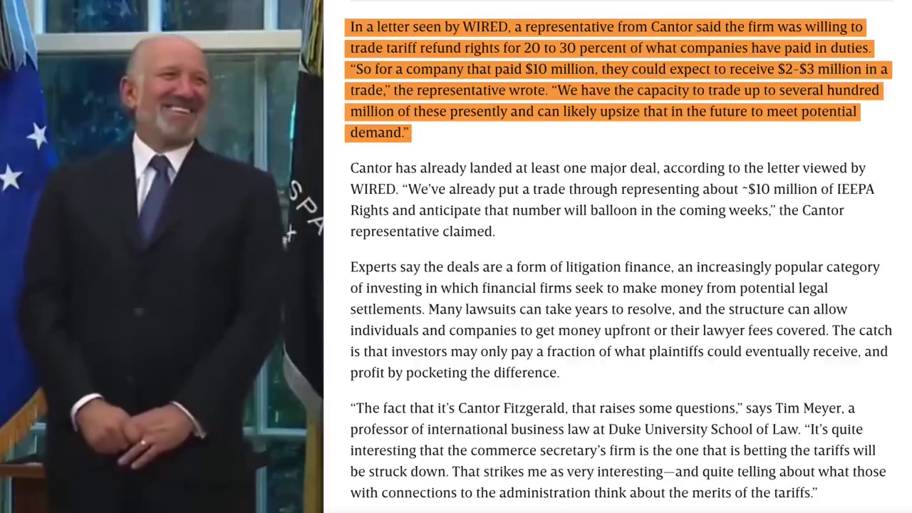 As of late 2025, Cantor Fitzgerald & Co. (run by his sons) bought tariff refund rights from U.S. importers for pennies on the dollar.